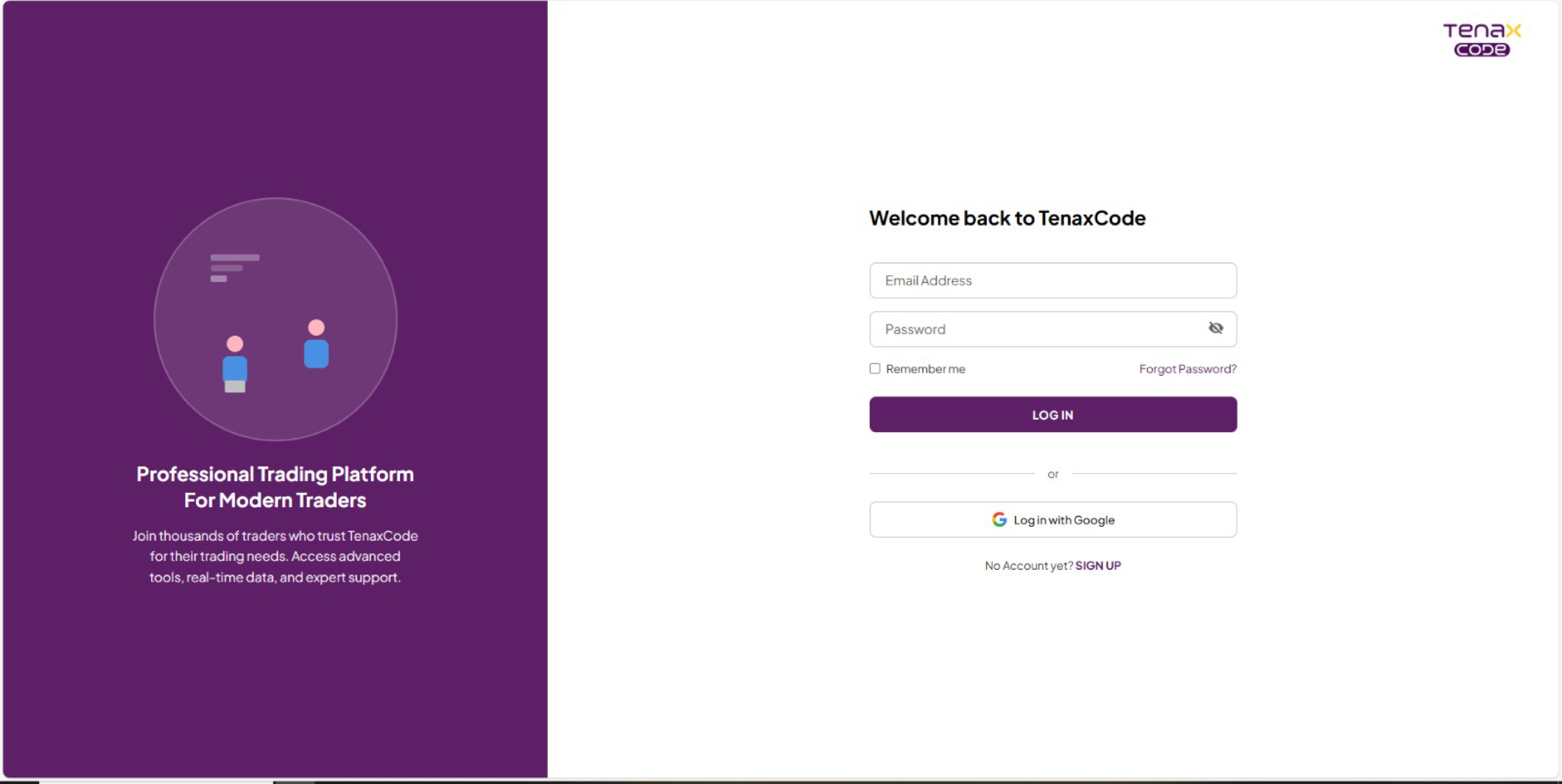 "Welcome back to TenaxCode." A professional, secure login interface that reinforces your brand identity from the very first interaction.