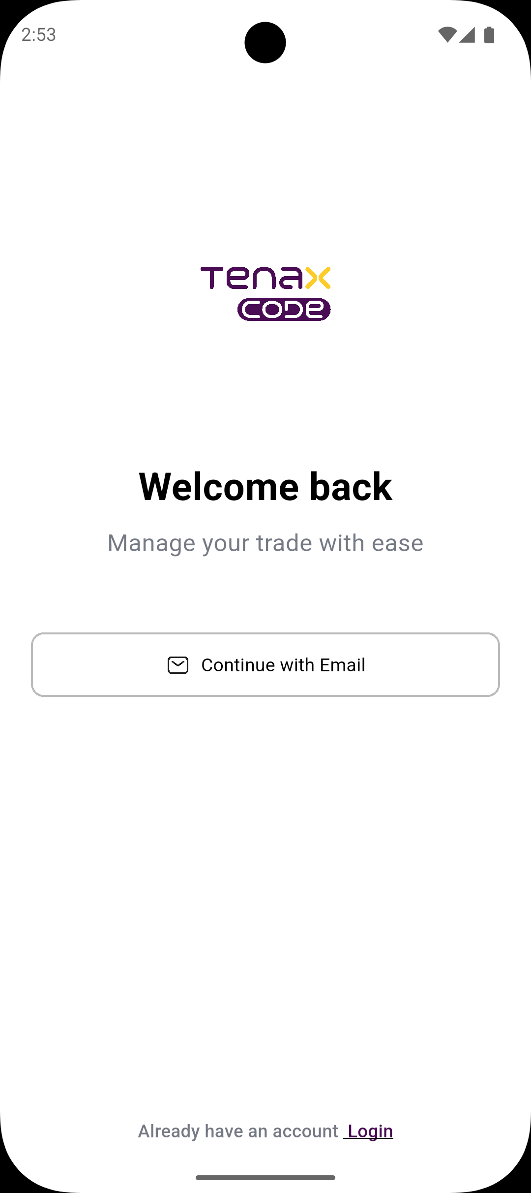 "Welcome back." Manage your trade with ease using our streamlined entry screen that offers quick access via email.
